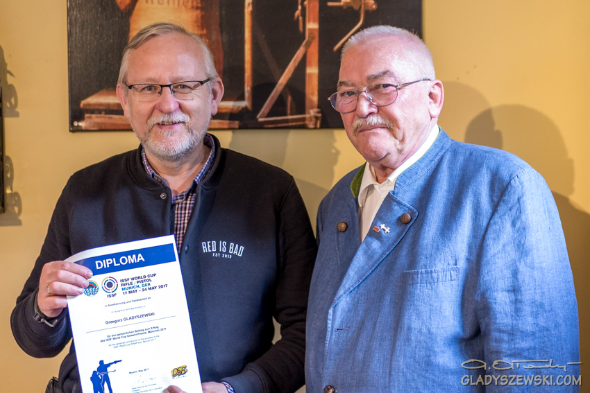środa, 17 maja 2017 r. O 13:00 sędziowie rozpoczynają swoje obowiązki. Dojazdu na strzelnicę nie ma, pozostaje taxi lub grzecznościowa podwózka przez Gary Andersona, DT zawodów. O zmianach w przepisach ISSF z taksówkarzem się nie pogada, a z wiceprezydentem ISSF - jak najbardziej. Strzelnica w Monachium, poza osią 25m, bazuje na systemie tarcz elektronicznych Polytronic. Taśma gumowa w EST 50m jest zamknięta, chodzi "w kółko", jest dużo grubsza od tych z SIUS. Nie ma możliwości rozstrzygania czegokolwiek na podstawie analizy tej taśmy. Jak zwykle (tutaj) nie ma tarcz bliźniaczych na osi 50m. Ogólne wskazanie dla sędziów - w Monachium nie ma obcych strzałów :-) Do tego połowa osi jest otwarta do 300m, a połowa zamknięta na 50m. I nikt nie narzeka...